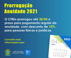 O Conselho Federal de Biologia publicou, nesta segunda-feira, a Portaria nº 317/2021, que prorroga o prazo para pagamento da anuidade 2021 para pessoas físicas e