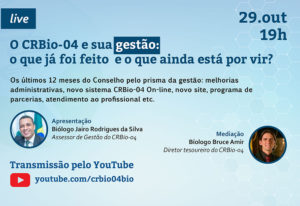O CRBio-04 promove na próxima quinta-feira (05/11), às 19h, a segunda das lives que marcam o primeiro ano da atual gestão. Os quatro conselheiros integrantes