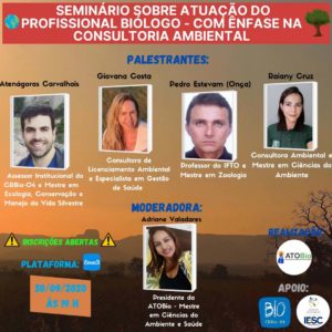 Fechando as comemorações do mês do biólogo, a Associação Tocantinense dos Biólogos promoverá, no dia 30 de setembro, seminário sobre atuação profissional na área de consultoria ambiental.