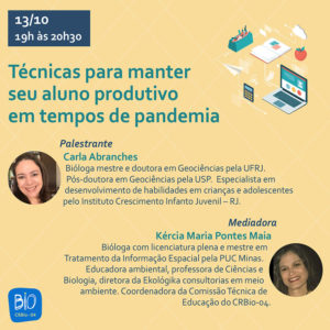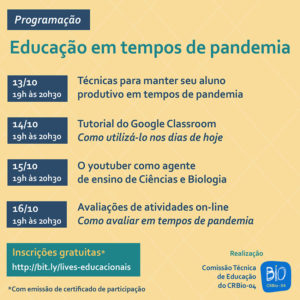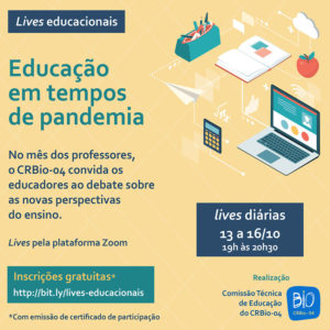 Como parte das comemorações pelo Dia do Professor, o CRBio-04 irá promover, de 13 a 16 de outubro, uma semana especial de lives abordando as novas perspectivas do ensino em tempos de pandemia.