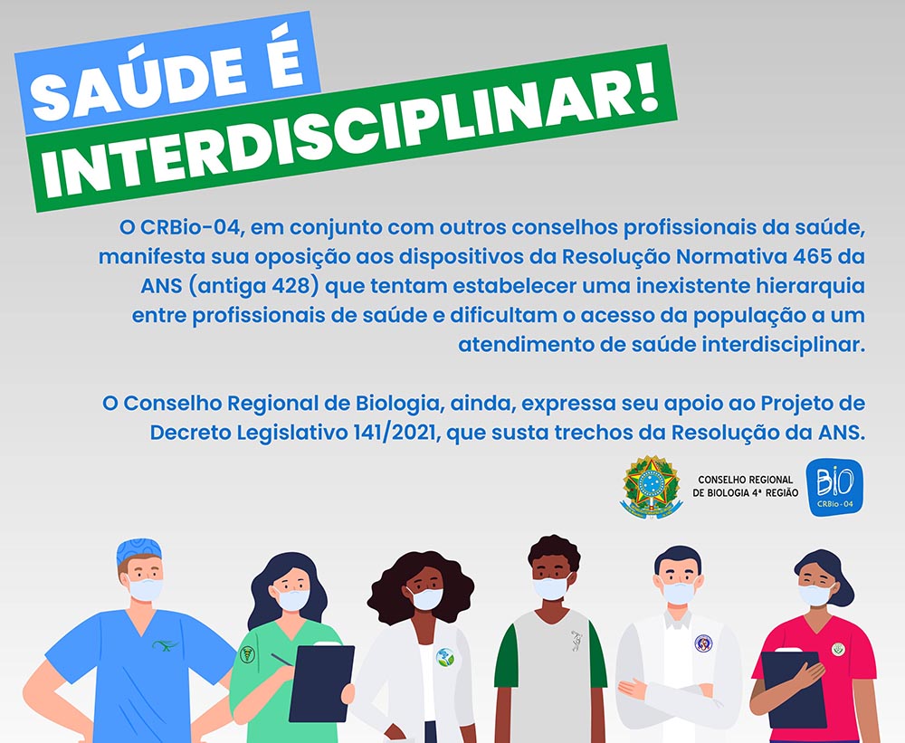 O CRBio-04, em conjunto com outros conselhos profissionais da saúde, manifesta sua oposição aos dispositivos da Resolução Normativa 465 (antiga 428) da Agência Nacional de Saúde Suplementar que tentam estabelecer uma inexistente hierarquia entre profissionais de saúde e dificultam o acesso da população a um atendimento de saúde interdisciplinar.