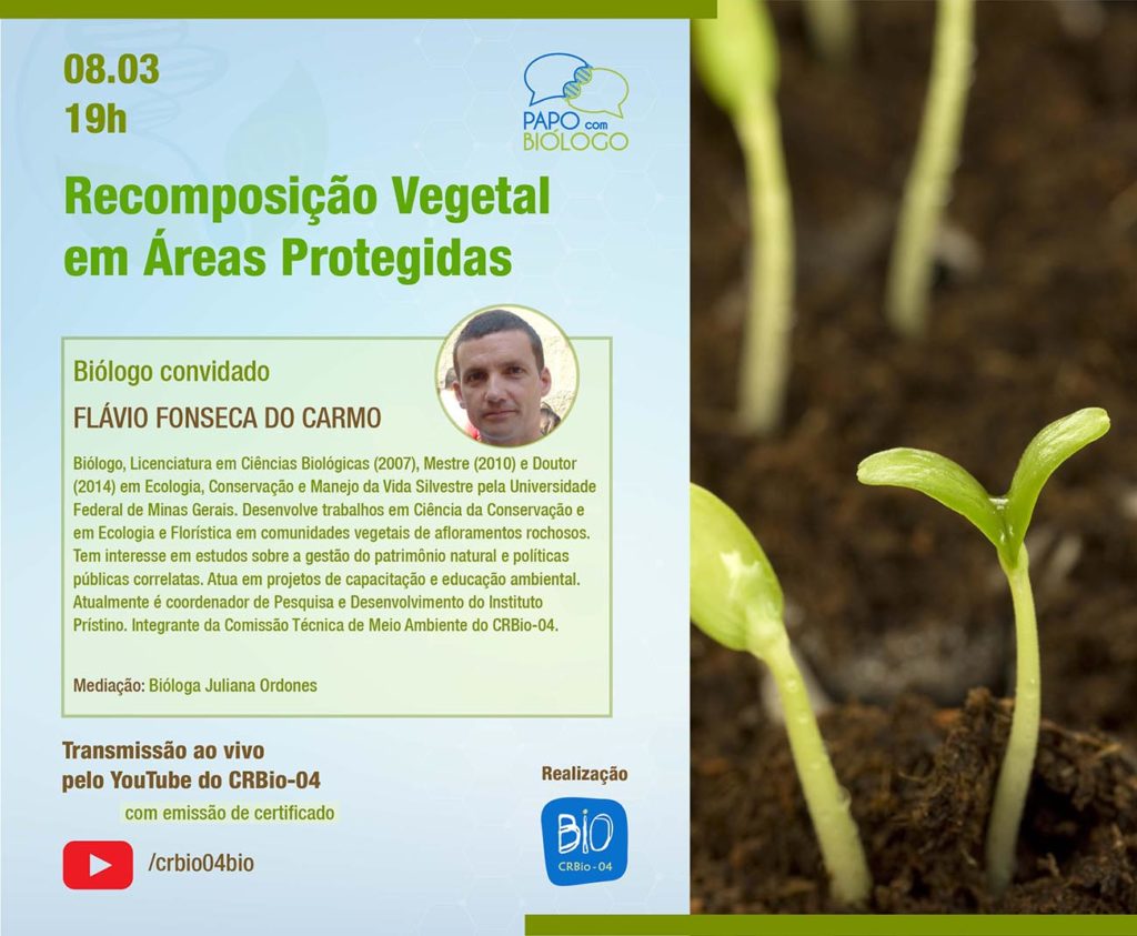 O tema desta edição será “Recomposição Vegetal em Áreas Protegidas”. Para palestrar e debater com os participantes o CRBio-04 convidou o biólogo Flávio Fonseca do Carmo.