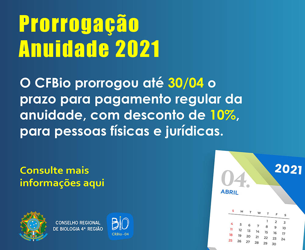 Mais informações: https://crbio04.gov.br/informacoes/anuidade-2021/.