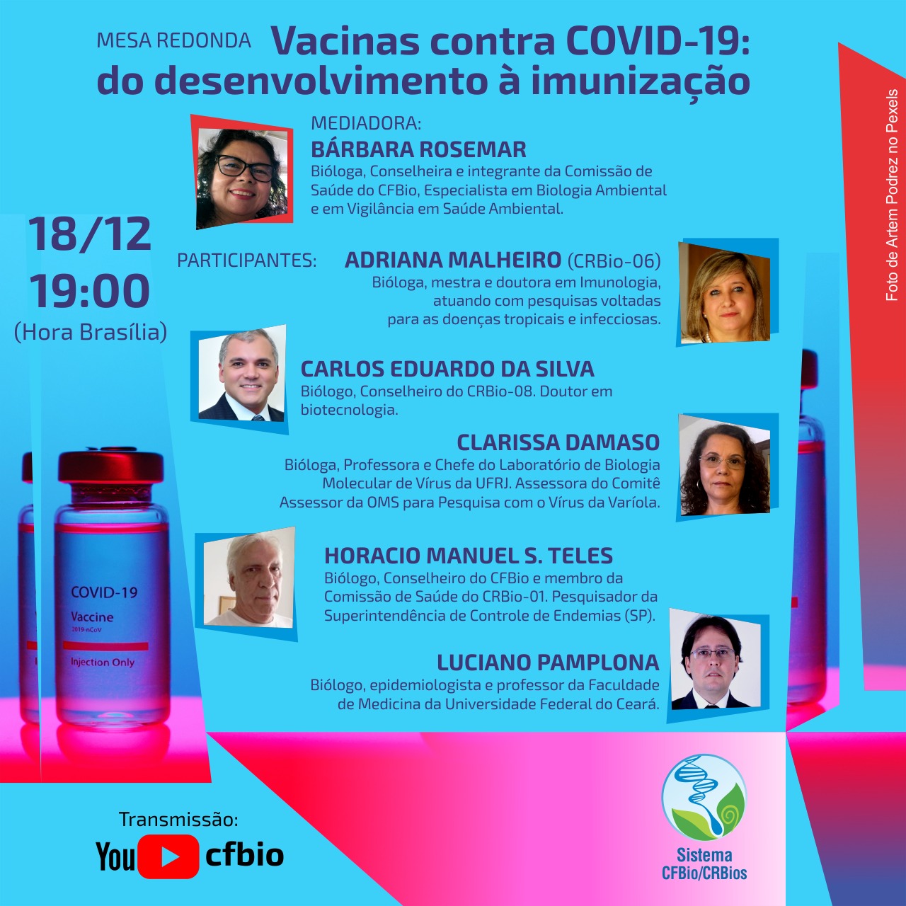 Com o objetivo de responder essas e outras perguntas, o Sistema Conselho Federal e Conselhos Regionais de Biologia (Sistema CFBio/CRBios) realizará a mesa redonda “Vacinas contra COVID-19: do desenvolvimento à imunização”. O evento será transmitido ao vivo na sexta-feira (18/12), às 19h (horário de Brasília), no canal do CFBio no Youtube.