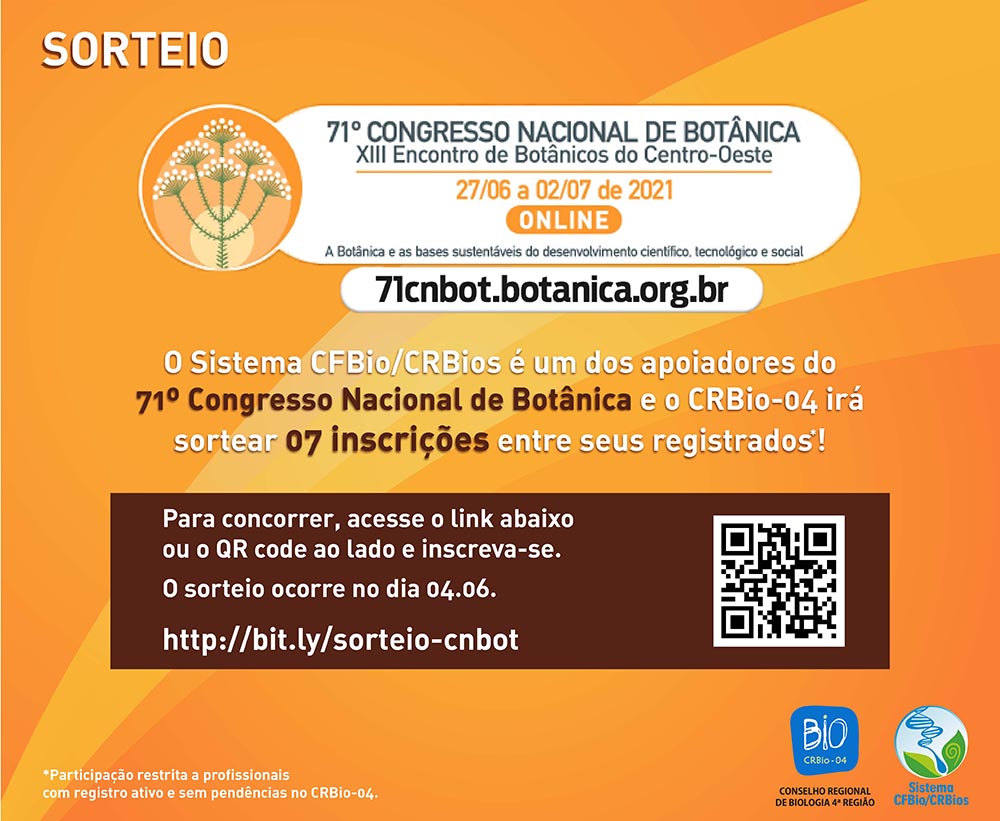 O CRBio-04 irá sortear, entre seus registrados, 07 inscrições para 71º Congresso Nacional de Botânica, que será realizado em formato on-line entre 27 de junho e 02 de julho.