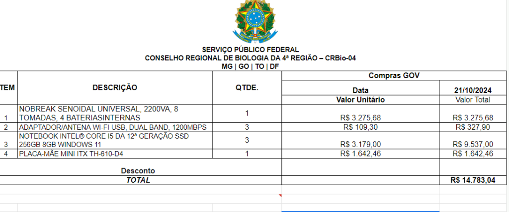 Conforme Art. 75, § 3º da Lei 14.133/2021, o CRBio-04 torna pública a intenção de compra dos seguintes materiais de informática: